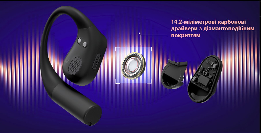 Звучание носит открытый и прозрачный характер. Низкие частоты физически ограничены форматом OWS, но технология Phantom Bass добавляет глубины и делает их более ощутимыми. Важным преимуществом является использование 14,2 мм драйверов с DLC‑покрытием, которые значительно больше типичных 6–8 мм большинства TWS-моделей. Именно они способствуют более чистому воспроизведению средних и высоких частот и формированию более широкой звуковой сцены.