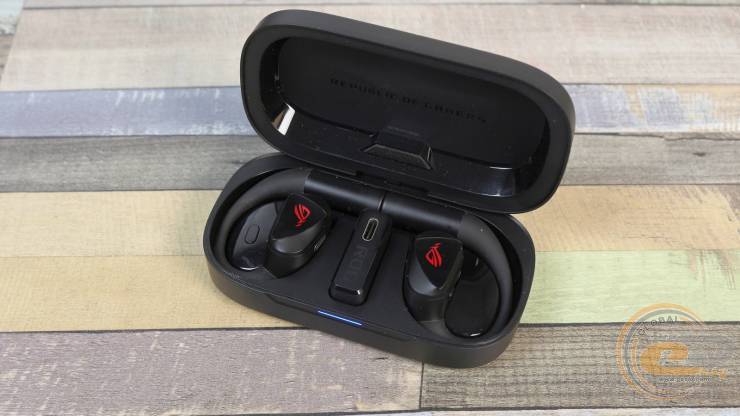 На задней части расположен порт USB-C для зарядки, а на передней – индикатор состояния. Внутри корпуса использована комбинация материалов: глянцевый черный пластик для углублений под наушники и донгл, матовый пластик с текстурой наклонных линий между ними, а также резиноподобная вставка на внутренней стороне крышки с надписью «REPUBLIC OF GAMERS». Наушники и донглы удерживаются в слотах благодаря магнитам, а сама крышка также имеет магнитное покрытие, что обеспечивает надежность при транспортировке. Рядом с углублением для левого наушника расположена кнопка сопряжения Bluetooth-соединения, выполненная из глянцевого черного пластика.