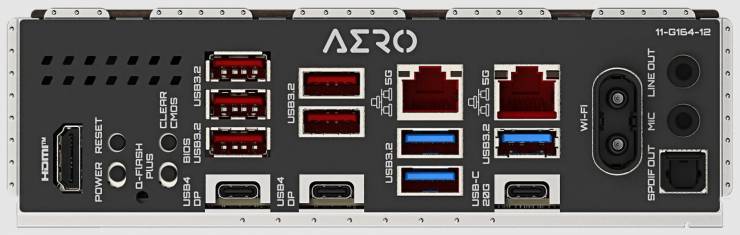 На плате отсутствуют USB4 и Thunderbolt 4, но задняя панель имеет USB 3.2 Gen 2 Type‑C (10 Гбит/с). Единственным сетевым интерфейсом выступает LAN 2,5 GbE на контроллере Realtek, а аудио реализовано базовым кодеком Realtek ALC887. Видеовыход представлен только DisplayPort. На задней панели расположены SMD‑кнопки для питания, сброса, очистки CMOS и перезагрузки BIOS через USB.