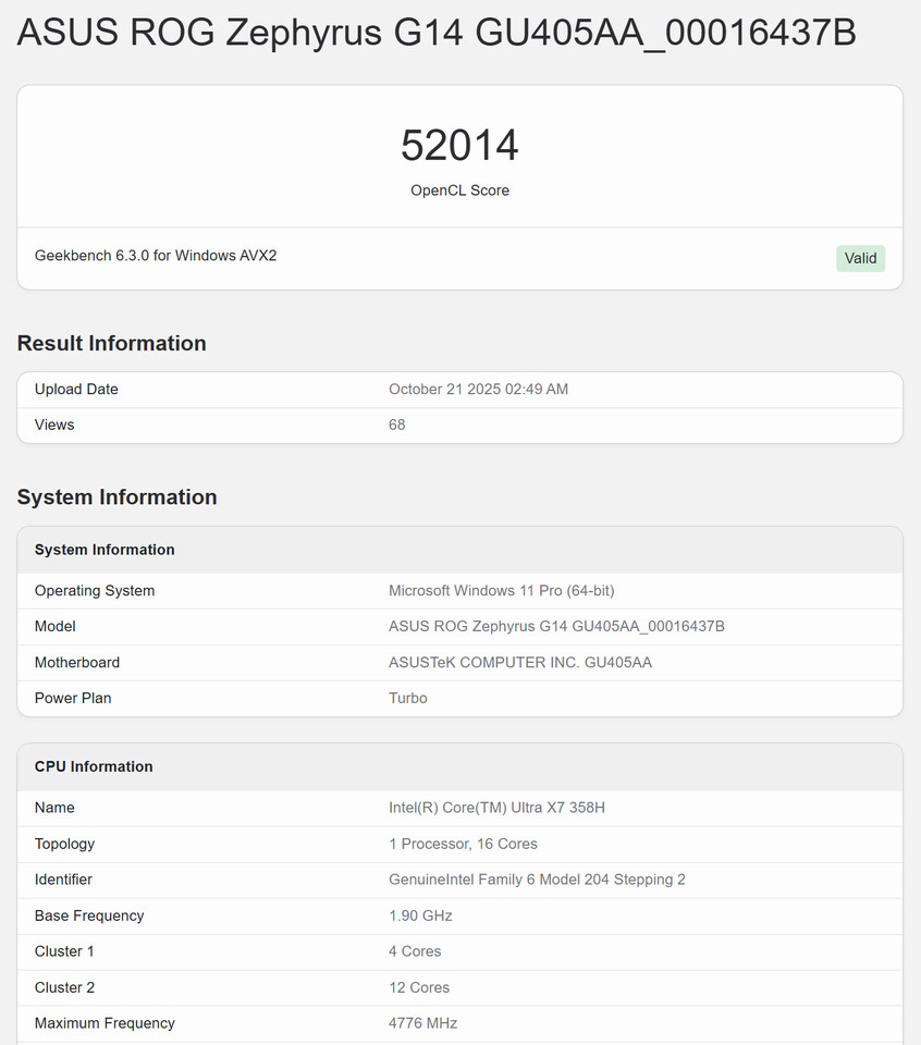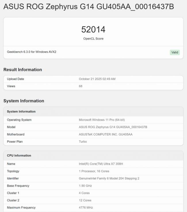 - OpenCL Score: Встроенный графический процессор (iGPU) набрал 52 014 баллов в тесте OpenCL.