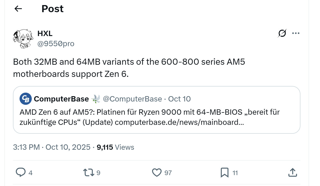 Известный инсайдер HXL подтвердил, что материнские платы серий 600 и 800 будут поддерживать Zen 6 независимо от того, оснащены ли они чипами BIOS на 32 МБ или на 64 МБ.