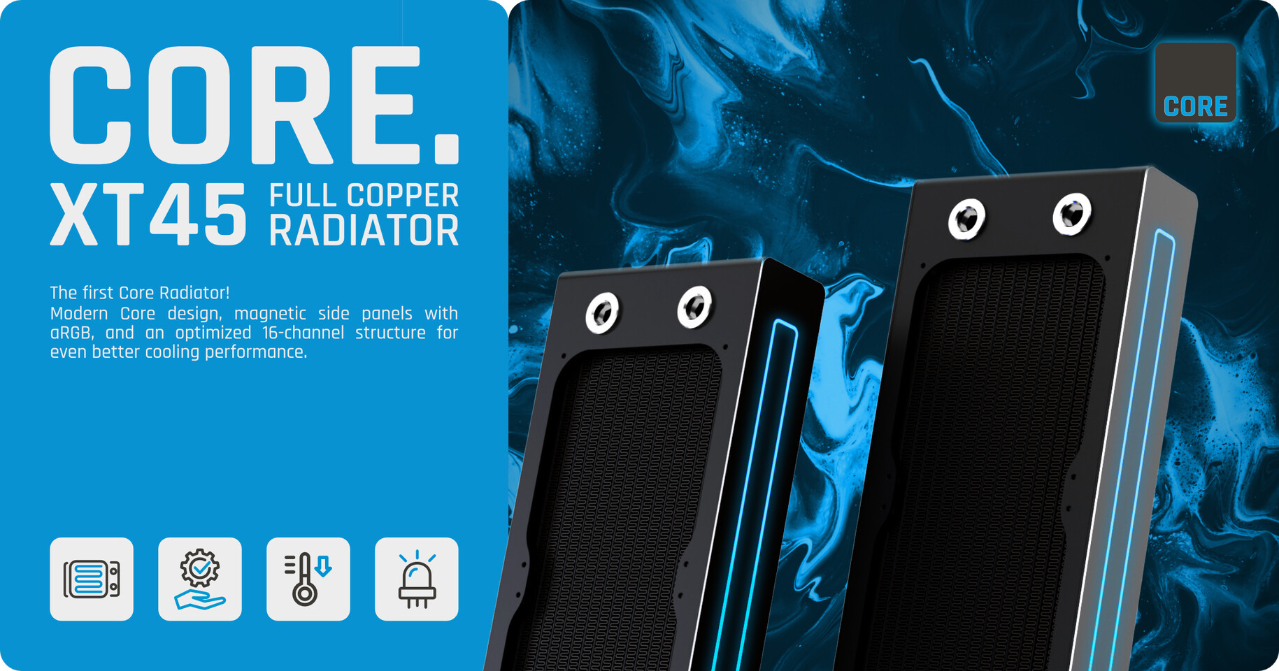 Все секции радиаторов Core XT45 выполнены из полностью медных компонентов для обеспечения максимальной тепловой эффективности. Переработанная внутренняя конструкция включает 16 водяных каналов вместо 12, а также более тонкую структуру ребер. Это значительно повышает производительность охлаждения, улучшая как поток жидкости, так и общую теплопередачу.
