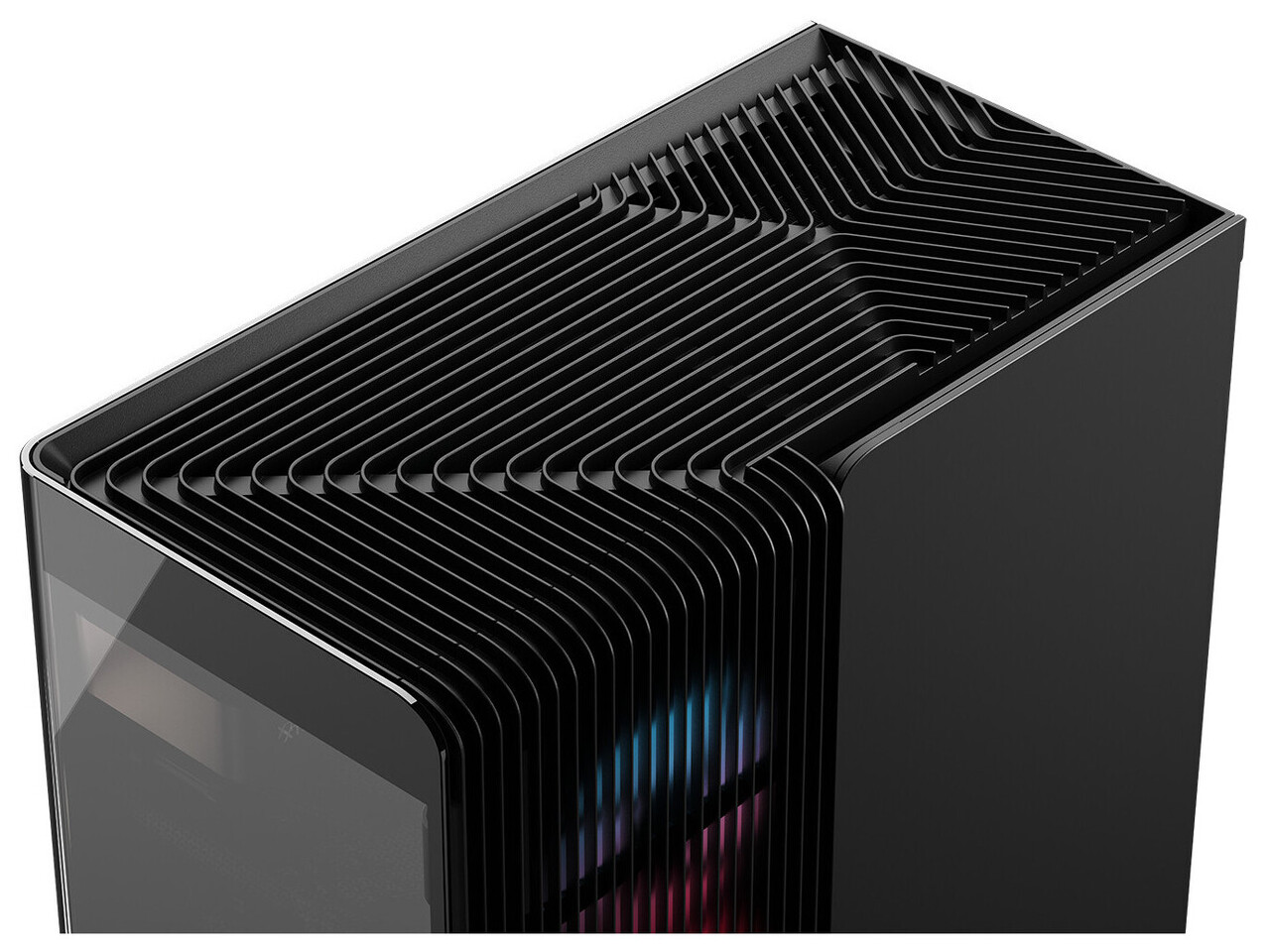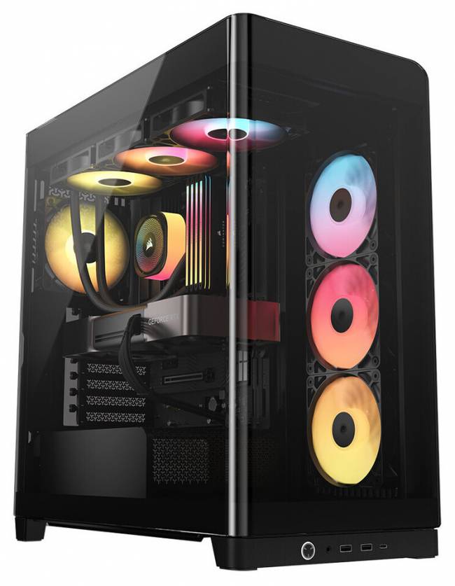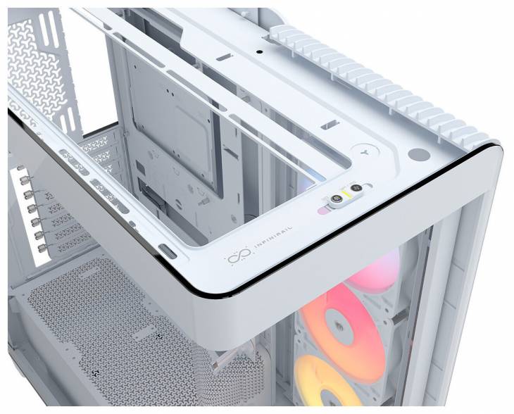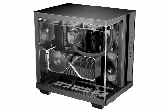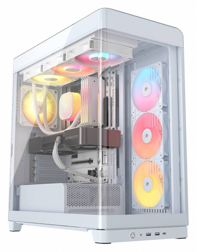 Модель, доступная в классических черном и белом цветах, предлагает беспрецедентный визуальный опыт благодаря инновационной бесстоечной конструкции. Передняя и левая боковые панели выполнены из закаленного стекла без каких-либо вертикальных металлических элементов, что создает эффект сплошного панорамного обзора компонентов.