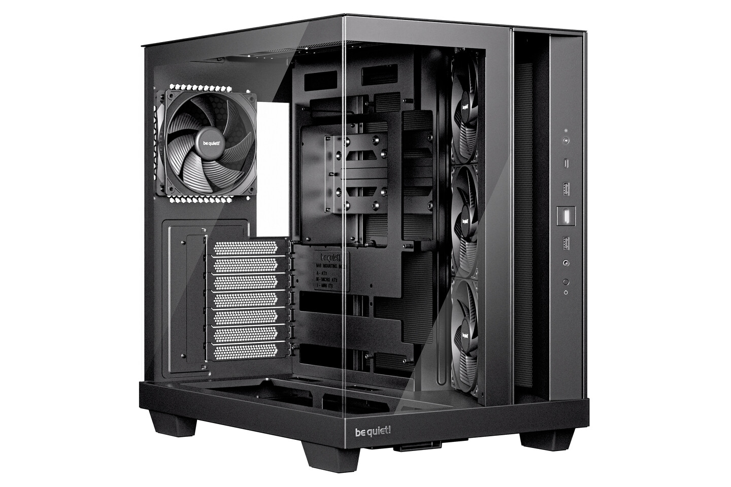Модель Light Base 500 предлагает минималистичный, ориентированный на производительность дизайн без RGB-подсветки. Она включает четыре предварительно установленных 120-мм PWM вентилятора Pure Wings 3: три боковых с реверсивными лопастями для оптимального впуска воздуха и один сзади для выпуска.