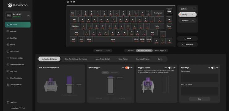 Обновленный контроллер теперь обеспечивает сверхвысокую частоту опроса 8000 Гц, хотя ради уменьшения задержки Keychron пожертвовала беспроводным подключением, которое было доступно в предыдущей серии Q HE. Обновленные датчики в Q2 HE 8K также делают клавиатуру совместимой с более широким ассортиментом магнитных переключателей, а не ограничиваются магнитными переключателями Gateron Double-Rail, как предыдущие клавиатуры Keychron HE.