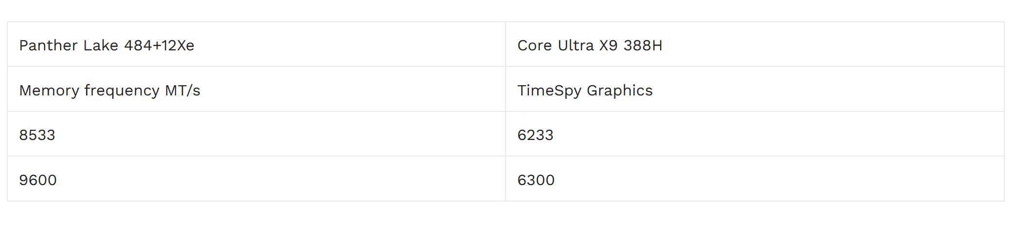 Впечатляющие данные получены из тестов 3DMark Time Spy, связанных с флагманским Core Ultra X9 388H, который, как сообщается, набирает около 6233 баллов с памятью 8533 MT/s и приблизительно 6300 баллов с более быстрыми модулями LPDDR5X 9600 MT/s. По сравнению с "Lunar Lake", лучшие конфигурации Panther Lake демонстрируют увеличение производительности почти на 33% в этих синтетических тестах по сравнению с интегрированным графическим процессором Lunar Lake Arc 140V. Это сопоставимо с самыми высокими результатами интегрированного графического процессора Arc 140V в 3D Mark Time Spy по данным из базы данных Notebookcheck, где интегрированный графический процессор Lunar Lake набрал 4721 балл.