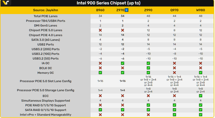 Z970 наследует ключевые характеристики B860, и получит расширенные возможности для энтузиастов. Он будет имеет те же 34 линии PCIe, однако с поддержкой разгона процессора, больше портов USB 3.2 и возможность RAID для PCIe. Это сделает его прямым конкурентом будущего AMD B950, который также ориентирован на средний сегмент с поддержкой разгона.