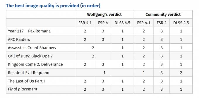 В тесте использовались игры Year 117: Pax Romana, ARC Raiders, Assassin’s Creed Shadows, Call of Duty: Black Ops 7, Kingdom Come 2: Deliverance, Resident Evil Requiem и The Last of Us Part I. В шести из семи случаев DLSS 4.5 обеспечил наилучшее качество изображения, тогда как FSR 4.1 победил только в Resident Evil Requiem.