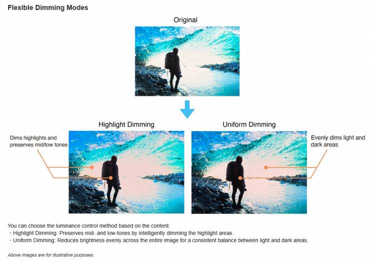 Чтобы минимизировать эффект ABL (автоматического ограничения яркости), применяются повышенные пороги яркости и два режима управления: Highlight Dimming, уменьшающий яркость только в светлых областях, и Uniform Dimming, равномерно снижающий яркость по всему экрану. Работу системы обозначает синий светодиодный индикатор.