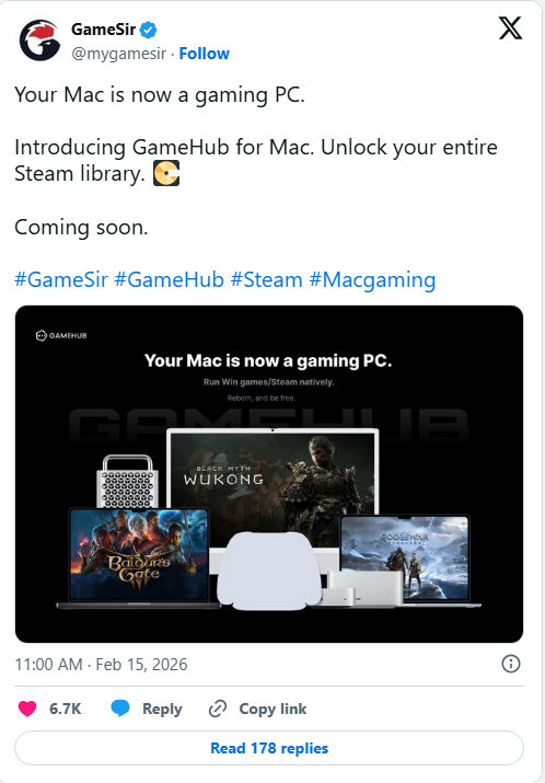 GameSir анонсировала GameHub для macOS — программное решение, которое позволит запускать Windows‑игры и библиотеку Steam прямо на компьютерах Apple.