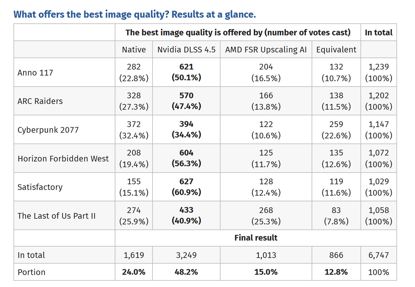 Результаты оказались однозначными: DLSS 4.5 получил наибольшее количество голосов во всех играх, набрав около 48% от общего числа голосов. Только в Cyberpunk 2077 игроки почти одинаково предпочитали нативный рендеринг, но и там DLSS 4.5 вышел вперёд с небольшим преимуществом.