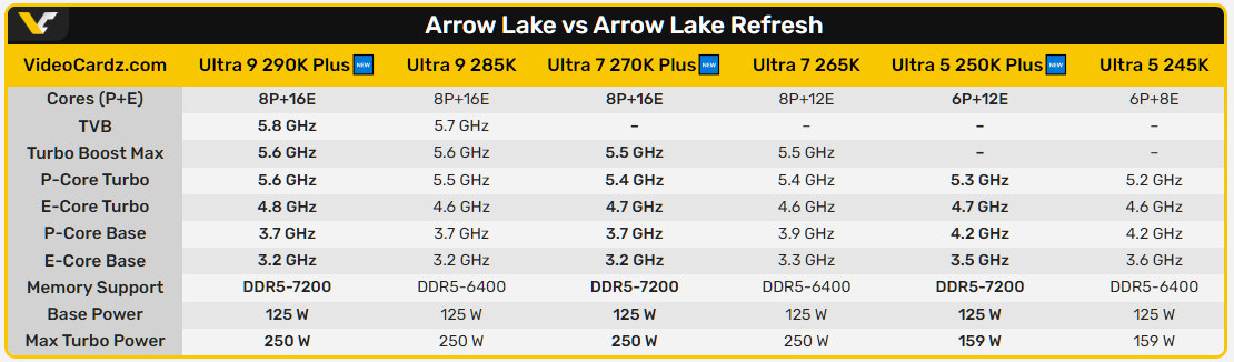 Новые чипы должны сохранить сокет LGA 1851 и совместимость с чипсетом Z890, предлагая более высокие частоты, большее количество ядер в некоторых сегментах и улучшенную поддержку памяти. Серия "Plus" будет включать флагманские модели Ultra 9 290K+, Ultra 7 270K+ и Ultra 5 250K+. Все модели сохраняют базовый тепловой пакет (TDP) на уровне 125 Вт, но, как ожидается, продемонстрируют значительный прирост производительности.