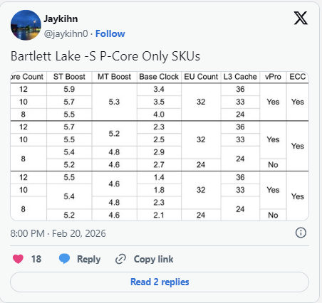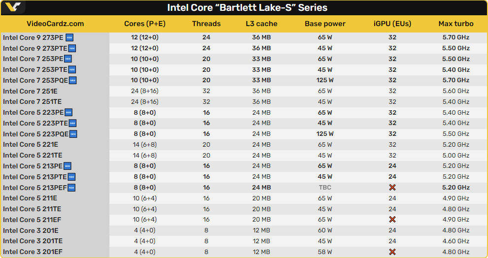 Известный инсайдер Jaykihn опубликовал таблицу с финальными характеристиками процессоров серии Intel Core 200E Bartlett Lake‑S, построенных исключительно на производительных ядрах (P‑cores).