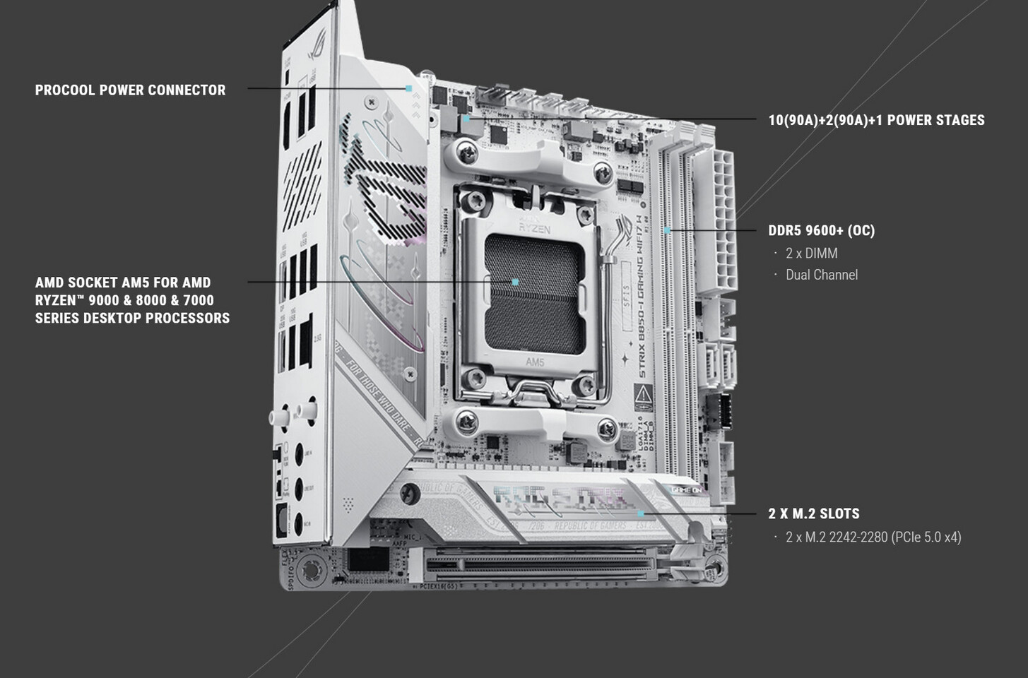 Это прямой спин-офф уже запущенной модели Strix B850-I Gaming WiFi7, выполненный в белом цвете.