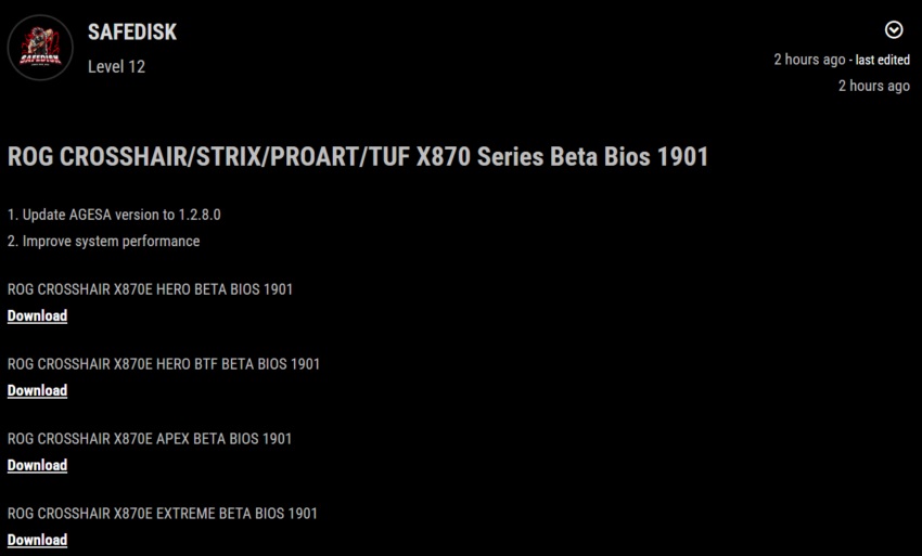 Прошивка 1901 для большинства моделей X870/X870E и 1501 для некоторых материнских плат Strix и TUF обновляет AMD AGESA до ComboAM5PI 1.2.8.0 и содержит простой список изменений: обновление AGESA улучшает производительность системы. Сборками поделился собственный специалист по разгону ASUS Safedisk, который также отмечает, что их безопасно использовать на этих платах.
