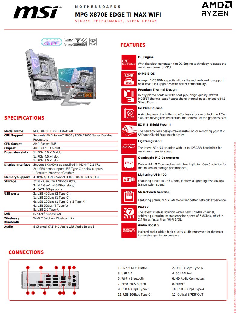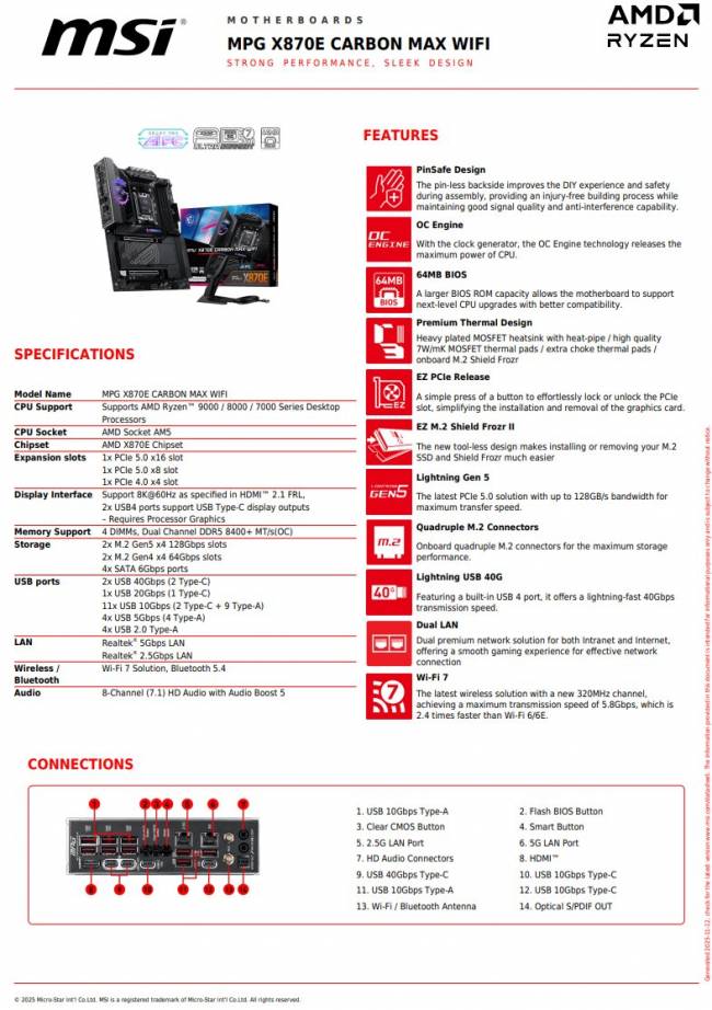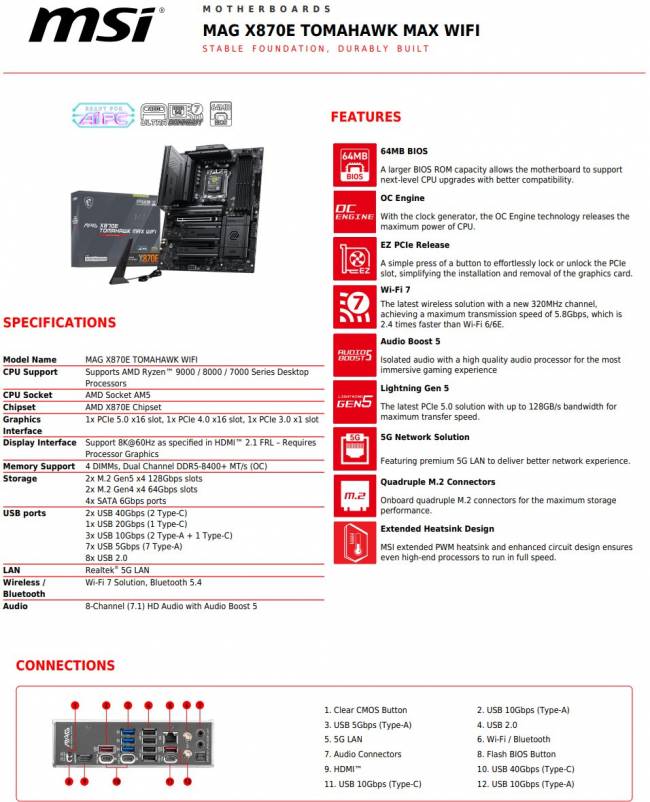 Три платы X870E MAX — MAG X870E Tomahawk MAX WiFi, MPG X870E Edge Ti MAX WiFi и MPG X870E Carbon MAX WiFi — придерживаются той же концепции с 64 МБ микросхем BIOS и поддержкой OC Engine. Они используют топовый чипсет AMD X870E с сокетом AM5 и предназначены для процессоров Ryzen 9000, 8000 и 7000. Их расположение схоже с существующими вариантами без приставки MAX, включая поддержку видеокарт PCIe 5.0 x16, варианты хранения данных PCIe 5.0 M.2 и четыре слота DDR5 DIMM. Премиальные модели MPG X870E Carbon MAX и Edge Ti MAX дополнительно оснащены портами USB Type-C со скоростью 40 Гбит/с.