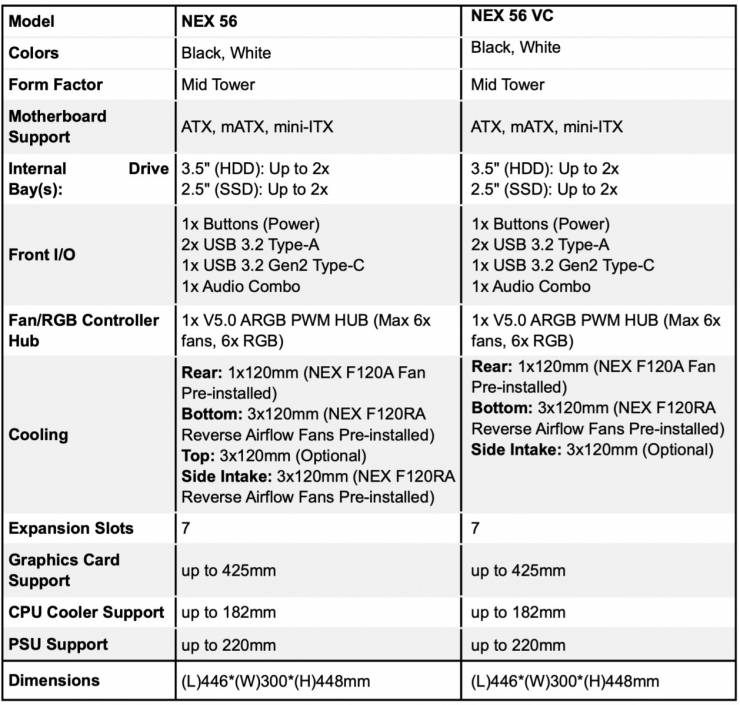 Серия состоит из двух моделей: базовой Nex C56 и версии Nex C56 VC. Последняя отличается наличием встроенного экрана на передней панели, позволяющего выводить показатели состояния системы в реальном времени или персонализированную графику. Оба корпуса поддерживают установку материнских плат форматов ATX, Micro-ATX и Mini-ITX. Двухкамерная компоновка позволяет скрыть блок питания и кабели в отсеке за материнской платой, что улучшает эстетику и оптимизирует воздушные потоки.