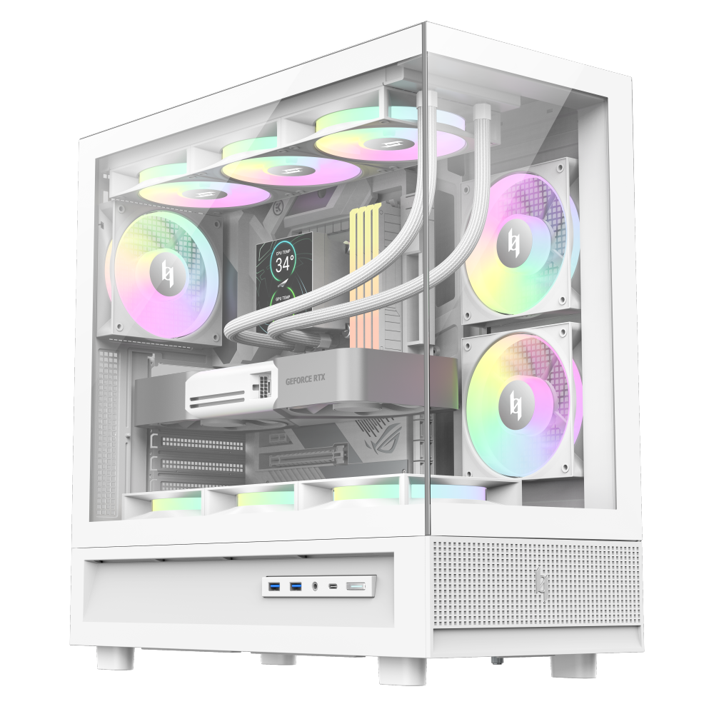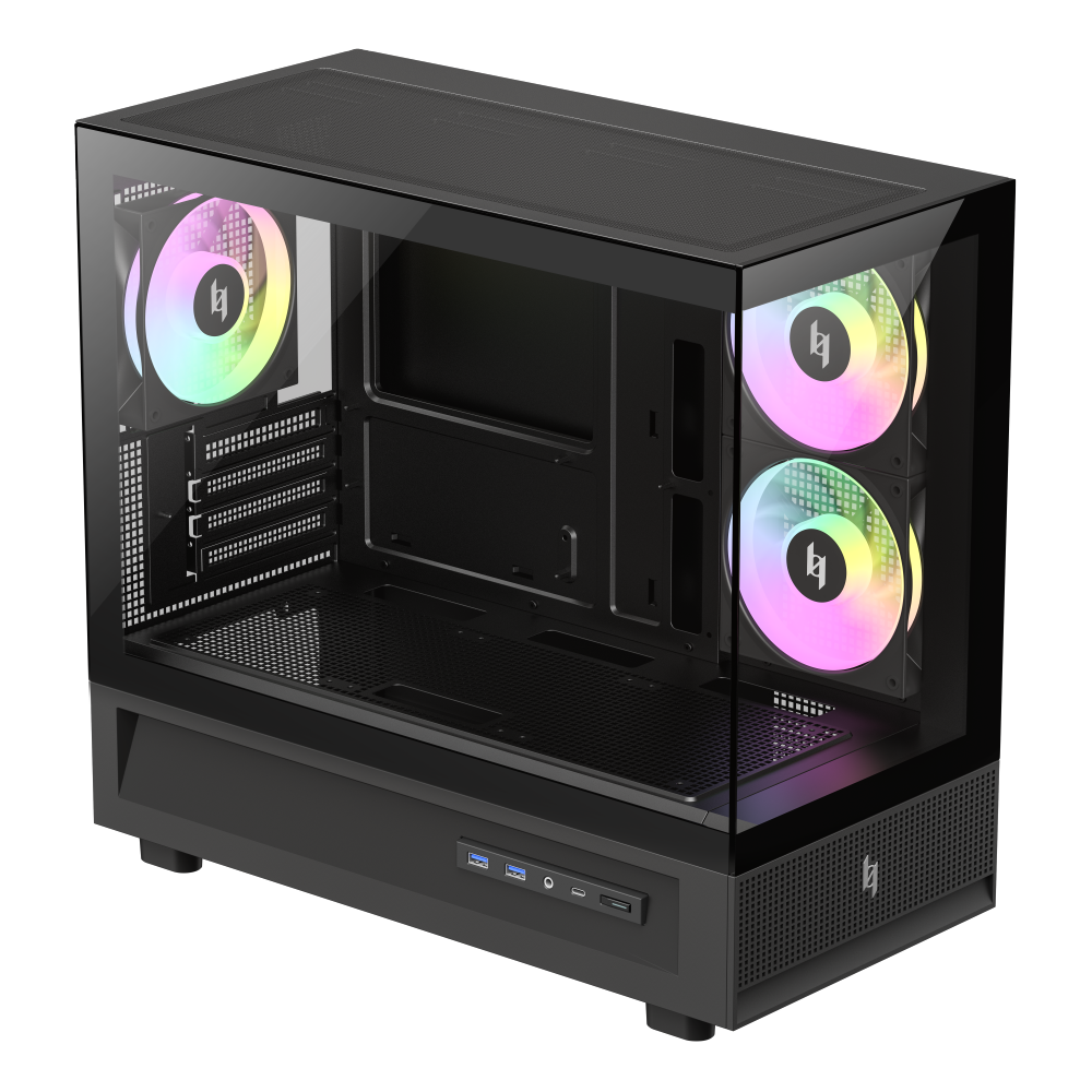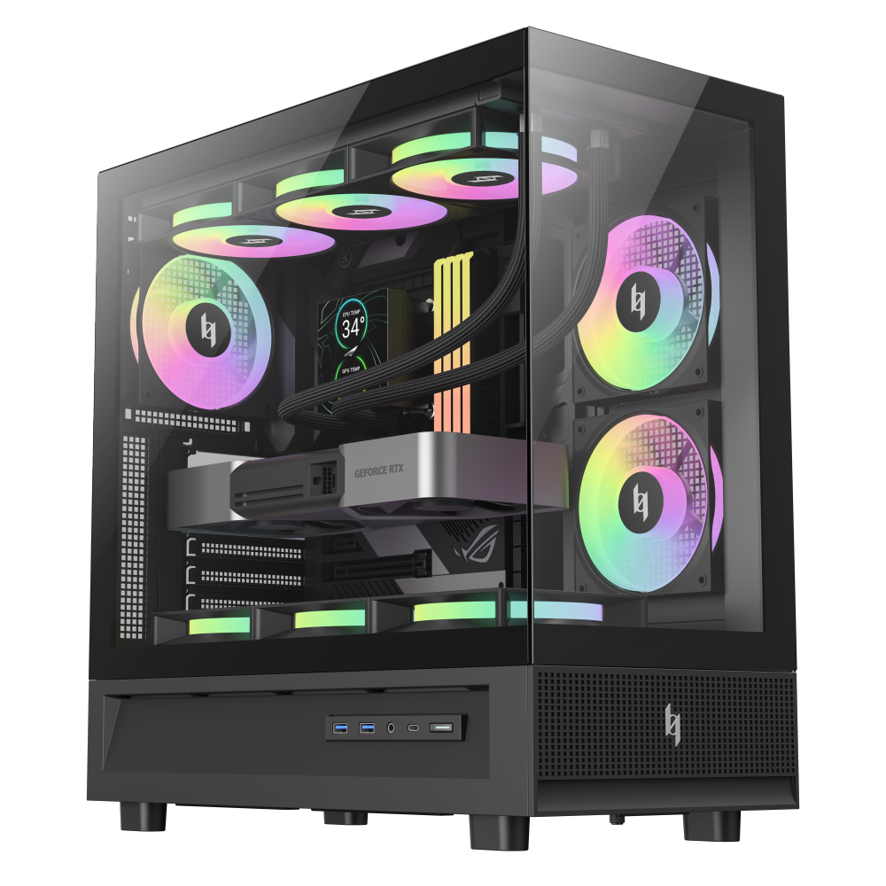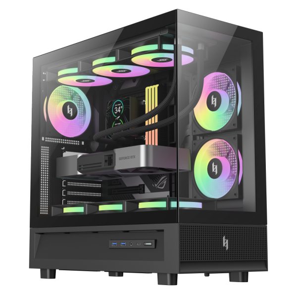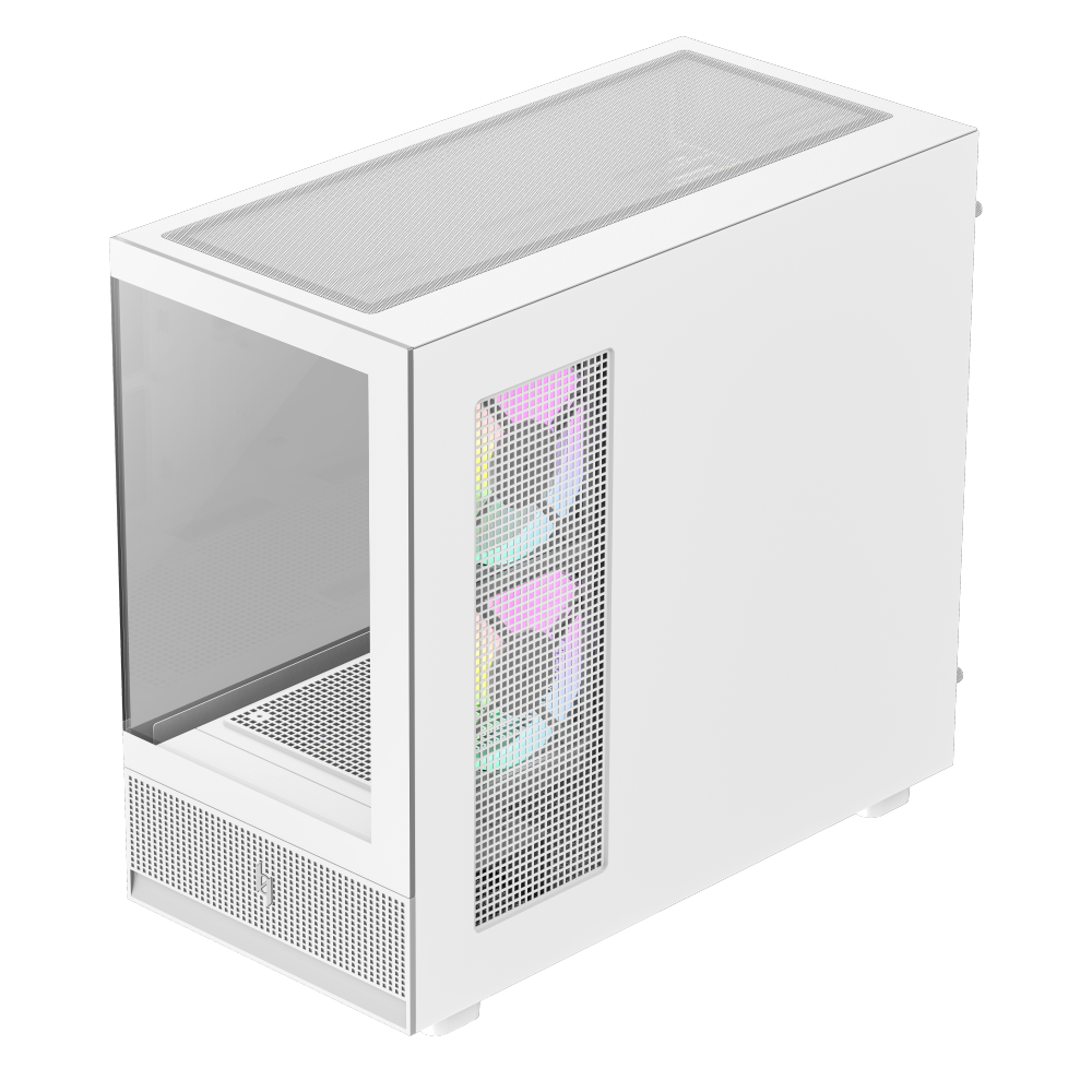NEX C31 в формате microATX воплощает ту же философию дизайна, но в более компактном корпусе. Он также поддерживает 360‑мм верхние радиаторы, современные видеокарты и кулеры, имеет панорамный стеклянный дизайн и комплектуется тремя ARGB‑вентиляторами. Благодаря компактности корпус подходит для небольших сборок, не жертвуя производительностью или визуальным эффектом.