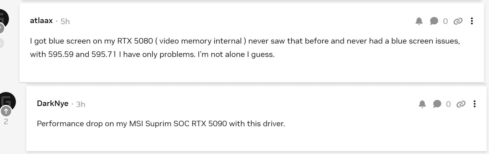 На форумах GeForce уже появилось множество сообщений о падении производительности после установки нового драйвера. Сообщество ждёт официальной реакции NVIDIA, так как пока неясно, является ли это намеренным изменением или ошибкой в драйвере.