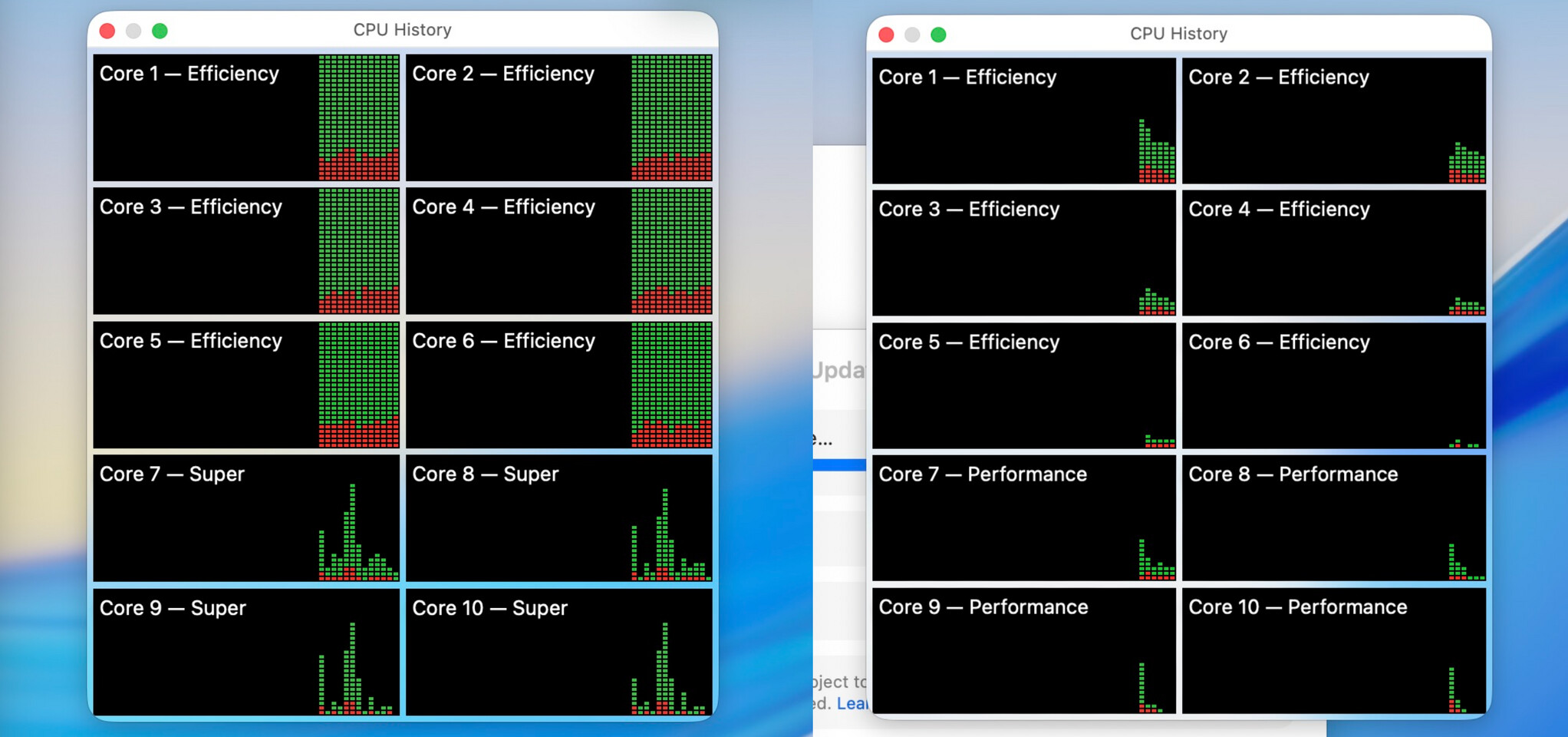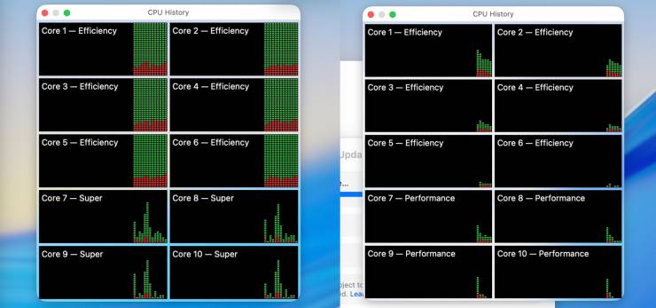 На скриншотах, предоставленных Ars Technica, видно, как новая система обозначений отображается по сравнению со старой. В обычном M5 производительные ядра теперь называются «Super Core», а эффективные ядра эффективности остались без изменений.