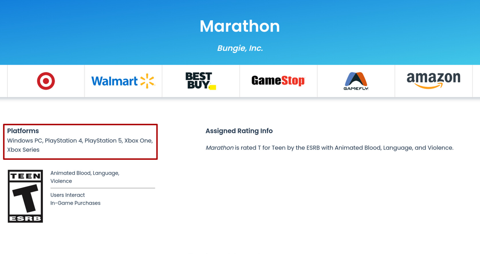 Согласно новому записи в базе ESRB, шутер Marathon от Bungie может появиться не только на ПК и современных консолях PlayStation 5 и Xbox Series XS, но и на PlayStation 4 и Xbox One.
