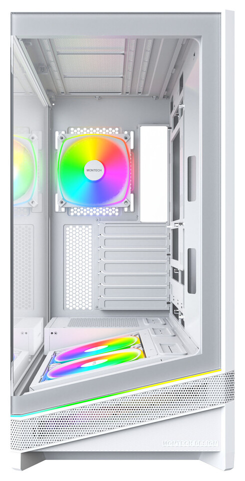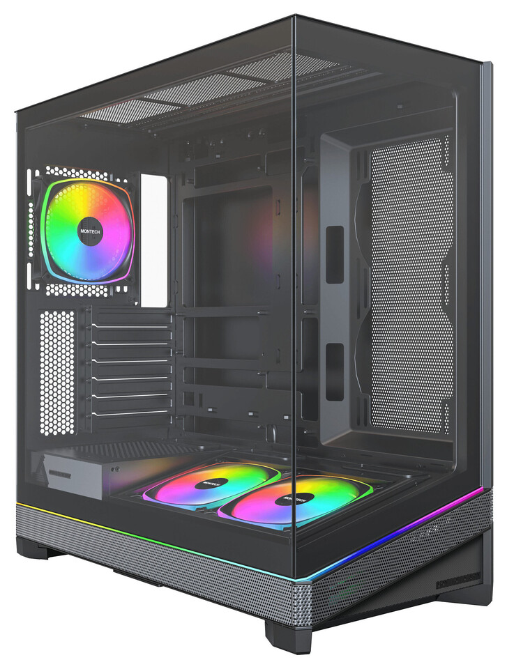 Корпус разработан с запасом для будущих видеокарт серии RTX 50, поддерживает увеличенную длину и толщину GPU, а также совместим с материнскими платами с обратным подключением, такими как ASUS BTF, MSI Project Zero и Gigabyte Project STEALTH. В комплект входят новые вентиляторы Montech AX120 PRO и RX120 PRO с ARGB‑подсветкой, которые обеспечивают эффективный воздушный поток сразу после установки.