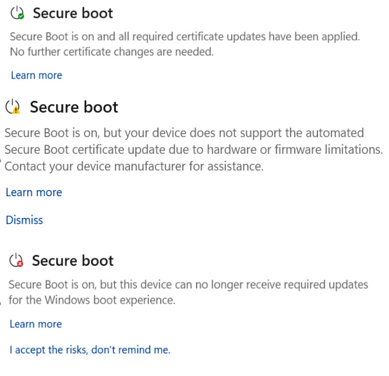 Предупреждения дублируются в системном трее, чтобы пользователи видели их даже без открытой программы. Для большинства современных ПК процесс происходит автоматически, но более старые модели могут потребовать дополнительных инструкций от производителей. Microsoft советует не игнорировать жёлтые или красные уведомления, так как отсутствие обновлённых сертификатов UEFI делает систему уязвимой для атак на уровне загрузки и может привести к несовместимости с будущими патчами Windows.