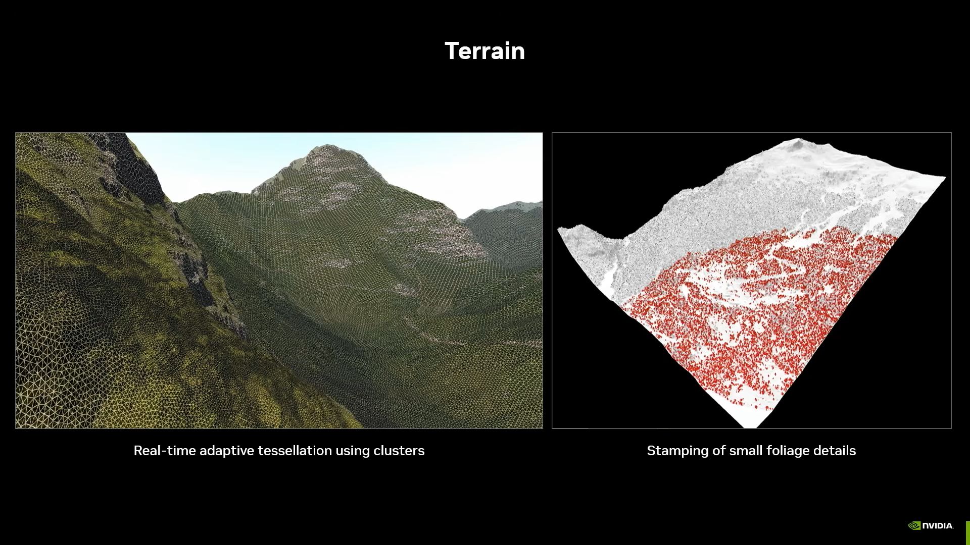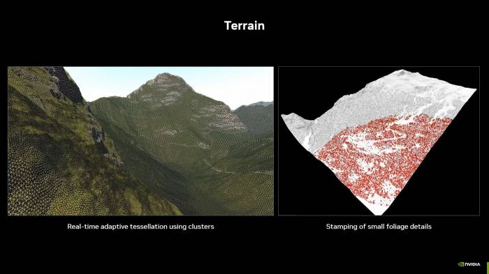 Сцена охватывала территорию 5×5 км с более чем 60 миллионами растений и около миллионом деревьев, каждое из которых моделировалось до уровня отдельных иголок без использования альфа‑карт. Крупные деревья превышали 10 миллионов полигонов. Использовалось полное трассирование лучей с двумя отражениями и DLSS Ray Reconstruction.