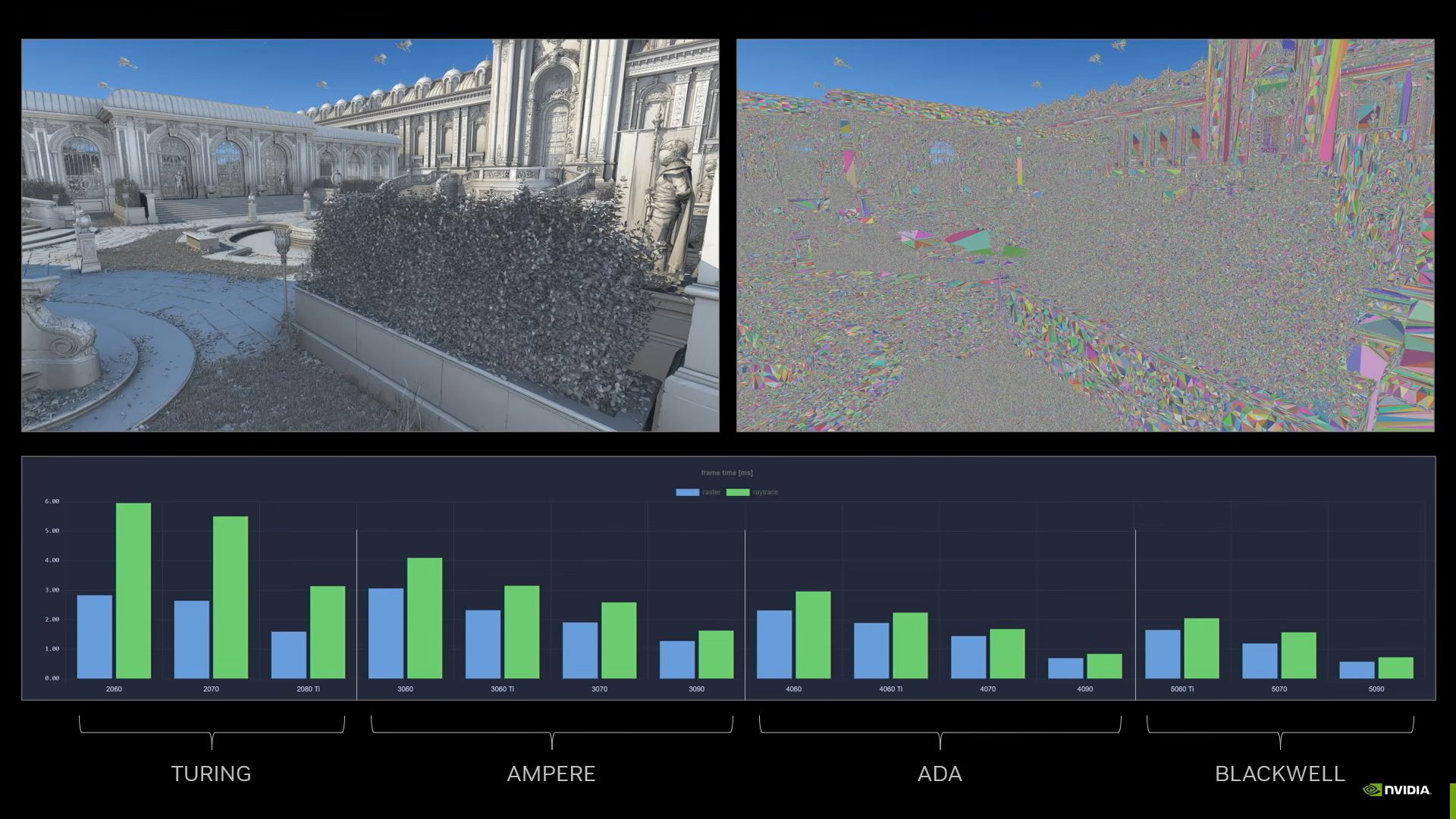 RTX 4070 в этом же демо показал около 58 кадров в секунду в 1440p с апскейлом из 960p. Видеопамяти хватало — сцена занимала около 9 ГБ из доступных 12 ГБ.