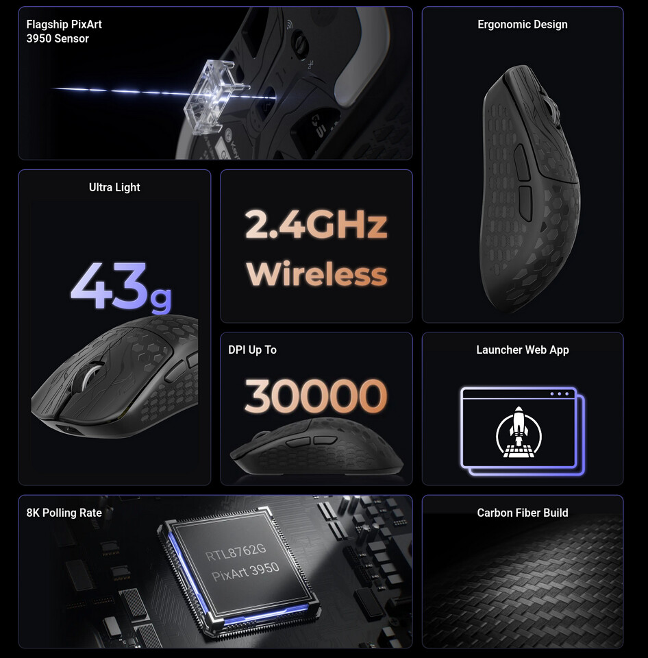 Обе модели оснащены сенсором PixArt PAW 3950 с частотой опроса до 8 кГц через 2,4 ГГц и поддержкой проводного подключения, а также Bluetooth 5.3 для менее интенсивного использования. Аккумулятор ёмкостью 500 мАч обеспечивает до 130 часов работы у G4 и до 162 часов у G5 в режиме Bluetooth. При частоте опроса 4 кГц время работы составляет 36 часов для G4 и 38 часов для G5, а при 1 кГц — 130 часов для G4 и 153 часа для G5. Используются переключатели Huano Transparent Yellow Shell White Dot с ресурсом 120 миллионов кликов.