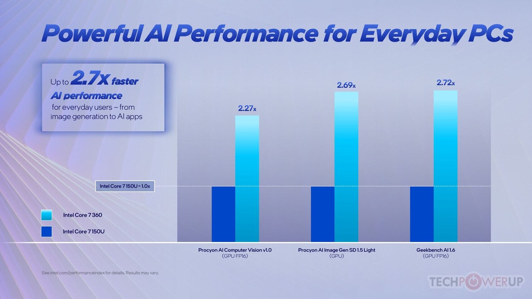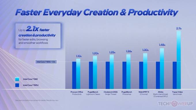 Intel сравнивает новинку с Core 7 150U (Raptor Lake‑U) и Core i7‑1185G7 (Tiger Lake), подчёркивая значительный прирост производительности благодаря новым архитектурным решениям. Компания заявляет о до 18,5 часов потокового видео Netflix, 12,5 часов офисной работы и 9,6 часов звонков Zoom с эффектами ИИ.