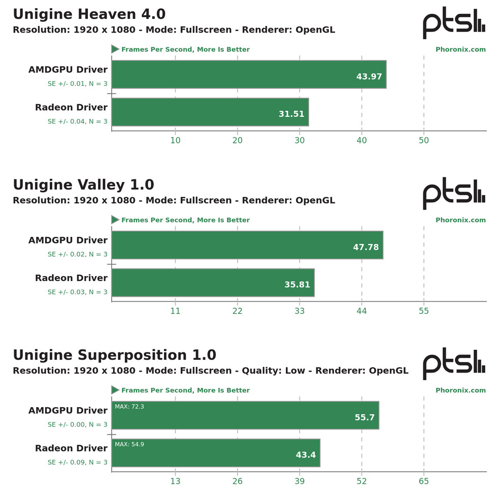 Этот переход стал возможен благодаря усилиям Valve. Ее инженеры долгое время работали над внедрением современных функций и стабилизацией драйвера amdgpu для старого железа, чтобы сделать его основным вариантом. Результаты тестирования впечатляют: на 13-летней видеокарте Radeon HD 7900 прирост производительности в отдельных тестах OpenGL (например, GravityMark 1.87) превысил 40%. Улучшения также зафиксированы в бенчмарках Unigine.