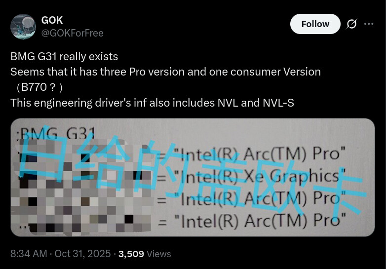 Недавнее открытие (распространенное @GOKForFree на X) в коде драйвера Intel подтверждает существование кристалла BMG-G31. Этот кремний ассоциируется именно с высокопроизводительной моделью Intel Arc B770.