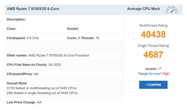 Новая утечка данных бенчмарка PassMark раскрыла, вероятно, следующий процессор AMD с технологией 3D V-Cache – Ryzen 7 9700X3D.