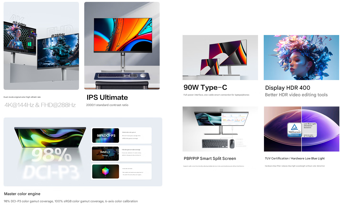 Модель U27U3XD позволяет пользователям выбирать между высокой четкостью изображения и высокой частотой обновления. В режиме 4K (3840x2160) частота обновления составляет 144 Гц, что оптимально подходит для профессиональных рабочих нагрузок и работы с контентом. В режиме FHD (1920x1080) монитор превращается в конкурентный игровой дисплей с частотой обновления 288 Гц.