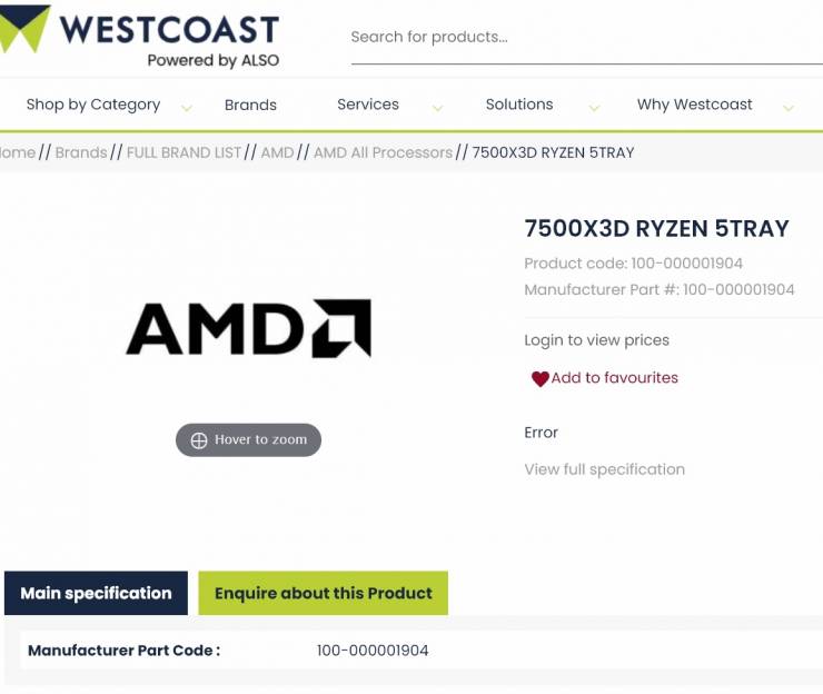 Похоже, что AMD готовится выпустить свой самый бюджетный процессор с технологией 3D V-Cache. Новый Ryzen 5 7500X3D был незаметно замечен в базе данных британского розничного продавца Westcoast UK, что является сильным намеком на его будущий релиз.