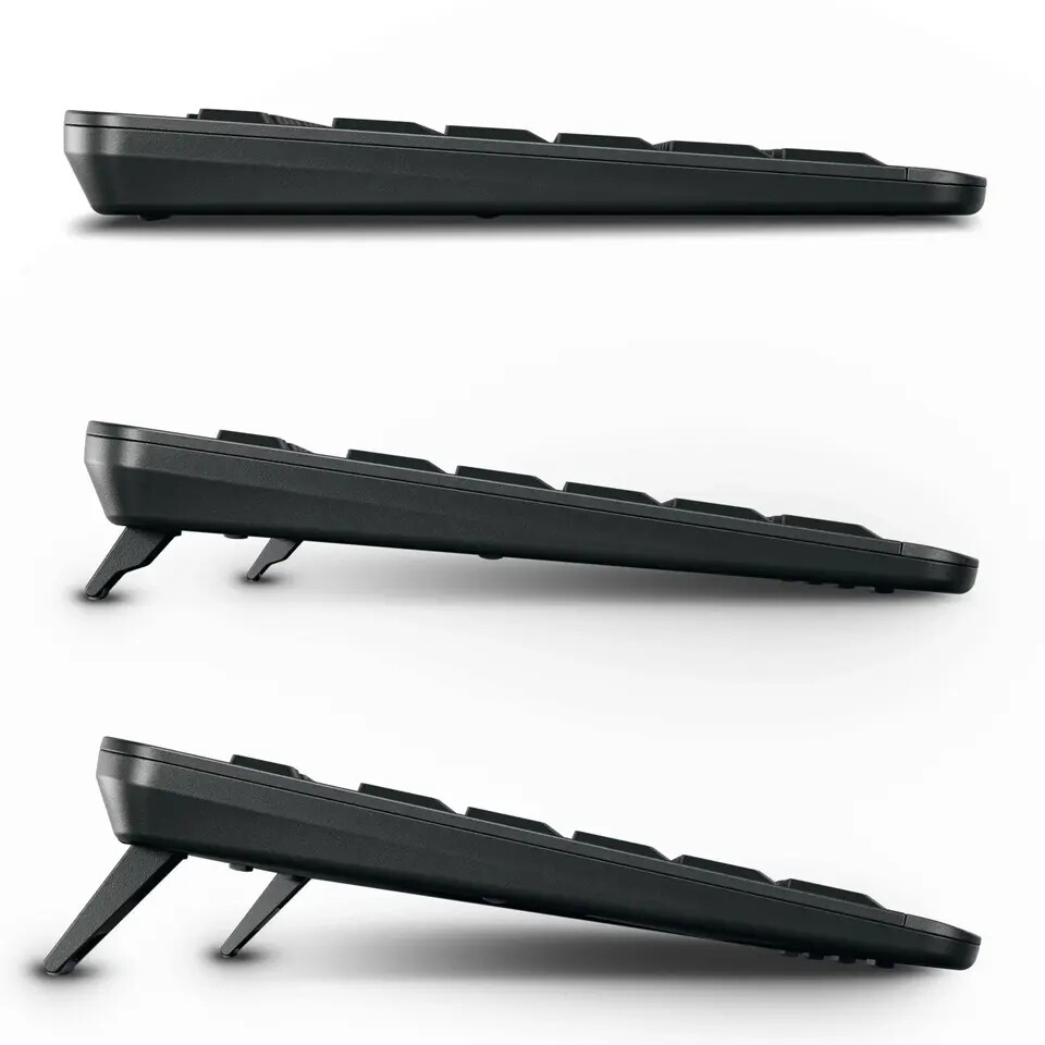 Клавиатура использует ножничный механизм CHERRY SX для тихой и точной печати. Она имеет белую подсветку с пятью уровнями яркости и дополнительные светодиоды состояния. Эргономический комфорт обеспечивается тремя углами наклона (0°, 4°, 8°) и прочной металлической пластиной. Клавиатура оснащена восемью горячими клавишами и встроенной кнопкой Co-Pilot для прямого доступа к поддержке искусственного интеллекта. Аккумулятор обеспечивает до пяти месяцев работы.