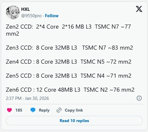 По предварительным данным, размер кристалла Zen 6 составит примерно 76 мм², что лишь немногим больше показателя Zen 5 (71 мм²). Такой плотности удастся достичь благодаря переходу на технологический процесс TSMC N2 (2 нм).