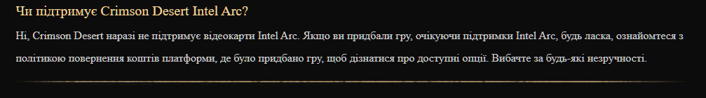 В FAQ разработчики прямо указали: «Нет, Crimson Desert не поддерживает Intel Arc. Если вы приобрели игру, рассчитывая на поддержку этих видеокарт, пожалуйста, ознакомьтесь с политикой возврата средств на платформе, где была куплена игра».