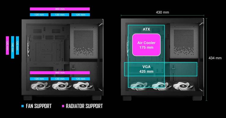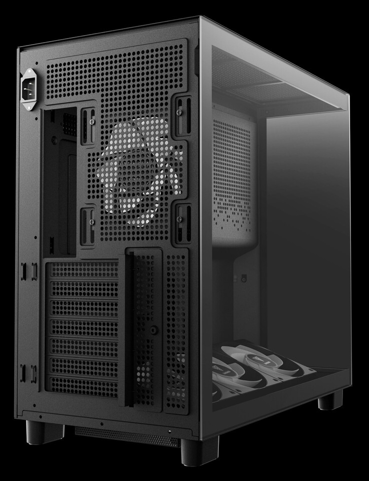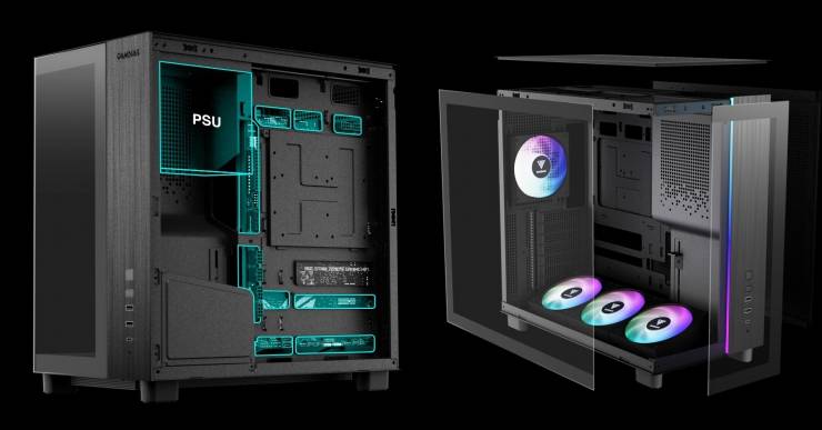 Главной особенностью новинки является панорамный обзор внутренних компонентов снизу доверху благодаря бесшовным панелям из закаленного стекла спереди и сбоку. Чтобы устранить визуальные барьеры, она перенесла блок питания в переднюю часть корпуса, развернув его разъемами вниз для более удобного кабель-менеджмента. Такая конструкция не только открывает беспрепятственный вид на систему, но и позволяет эффективнее использовать пространство для установки мощных комплектующих, включая видеокарты длиной до 425 мм.