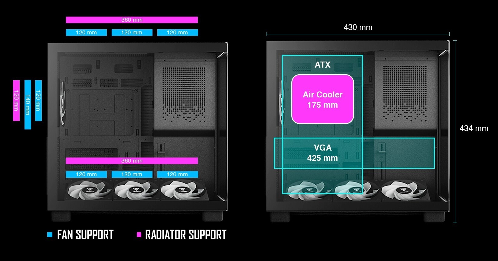 Gamdias оснастила корпус уникальной регулируемой системой нижних вентиляторов, которые можно устанавливать под шестью разными углами для точного направления потока на графический процессор. В комплекте поставляются четыре тихих 120-мм вентилятора NOTUS M1 ARGB, которыми управляет встроенный 8-портовый концентратор с поддержкой ШІМ и синхронизацией подсветки.