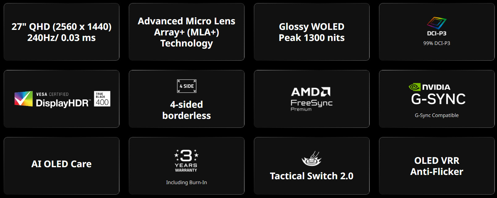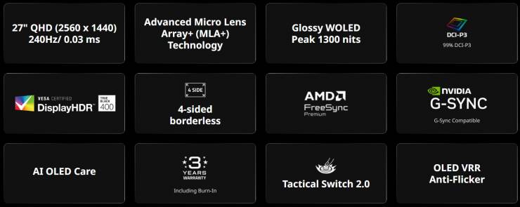 Монитор поддерживает AMD FreeSync Premium и NVIDIA G‑Sync Compatible, имеет сертификацию VESA DisplayHDR True Black 400 и охват 99% DCI‑P3. Среди игровых функций — Tactical Switch 2.0, Ultra Clear для уменьшения размытия движения и Black Equalizer для детализации тёмных сцен.