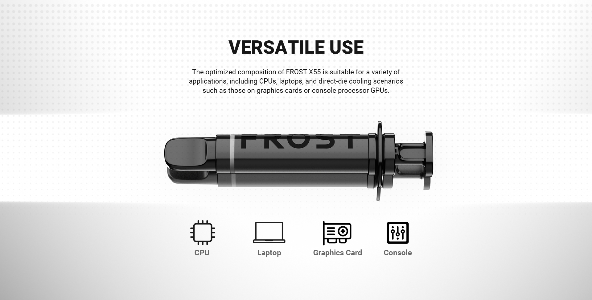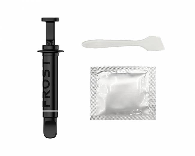 Вместе с кулером дебютировала высокоэффективная термопаста FROST X55 с впечатляющим показателем теплопроводности 16,2 Вт/мК.