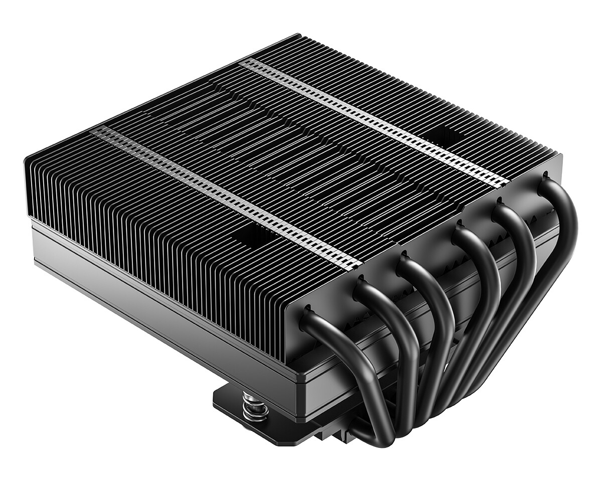 При общей высоте всего 77 мм кулер оснащен шестью тепловыми трубками и никелированным медным основанием, что позволяет ему эффективно отводить до 150 Вт тепла. Конструкция радиатора со сложенными ребрами использует технологию пайки оплавлением для максимально качественной теплопередачи, при этом устройство обеспечивает полную совместимость с модулями оперативной памяти любой высоты. За обдув отвечает тонкий 120-мм вентилятор с поддержкой ШІ-управления через ШИМ, создающий воздушный поток до 65,2 CFM при уровне шума не более 33,9 дБ(A). Пользователи могут настроить вентилятор как на вдув, так и на выдув в зависимости от особенностей корпуса.