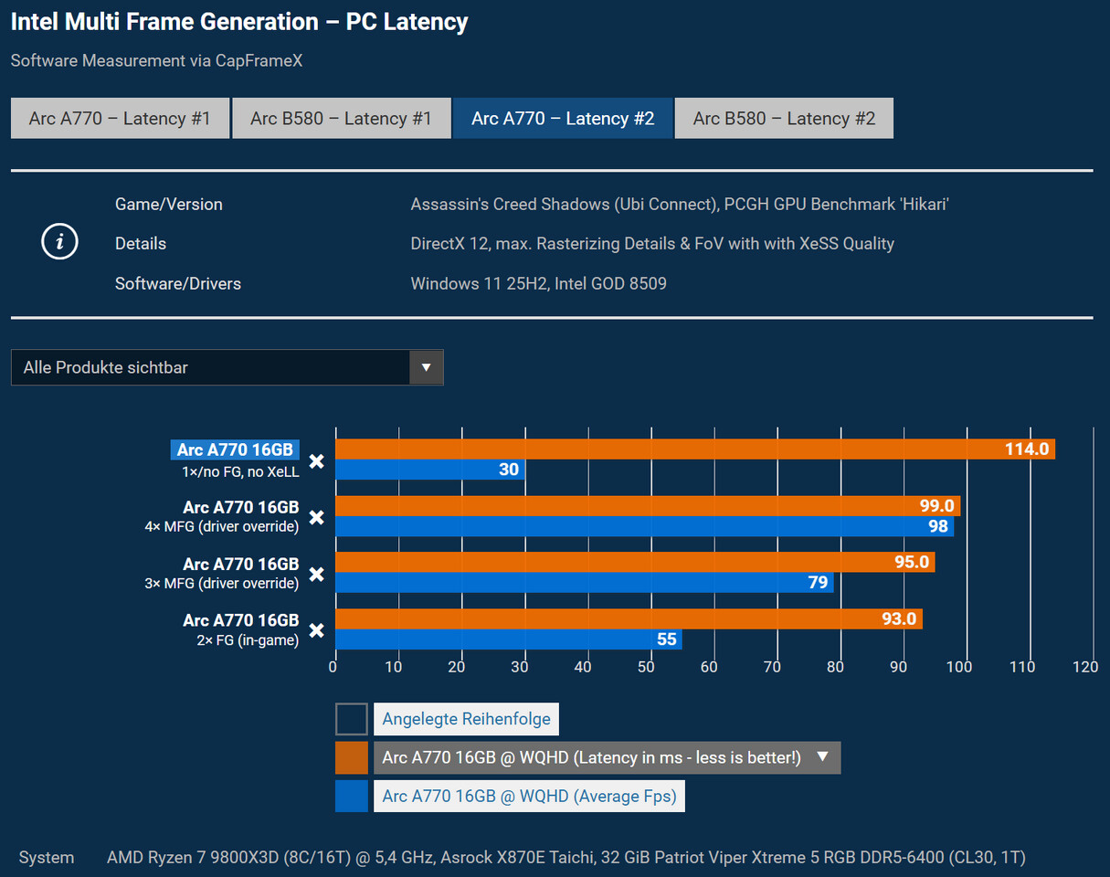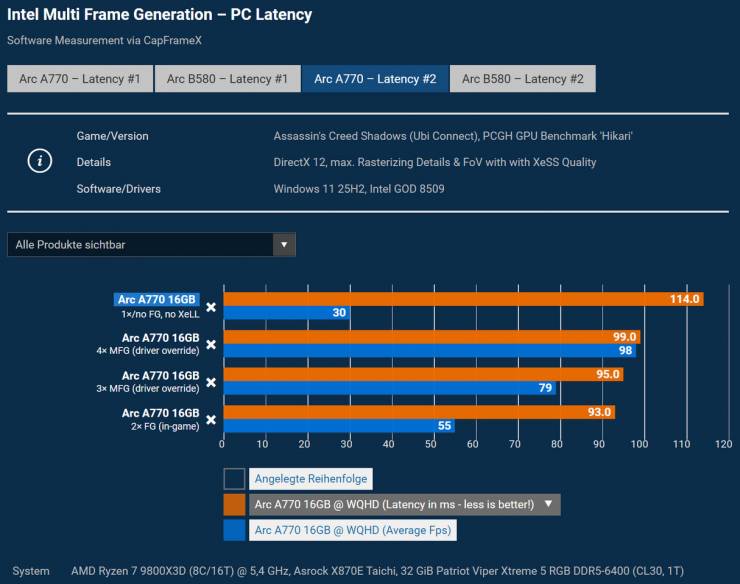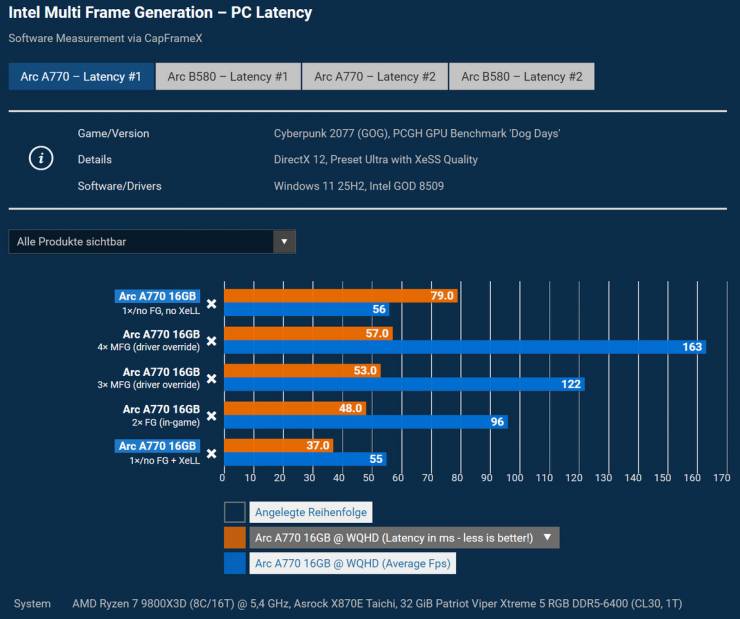 ASRock Arc A770 Phantom OC 16 ГБ, вышедшая ещё в 2022 году, показала заметное улучшение благодаря MFG. Благодаря 16 ГБ памяти узких мест не возникает, а с включённым XeLL карта демонстрирует стабильную производительность. Arc B580 масштабируется ещё лучше за счёт обновлённого «железа».