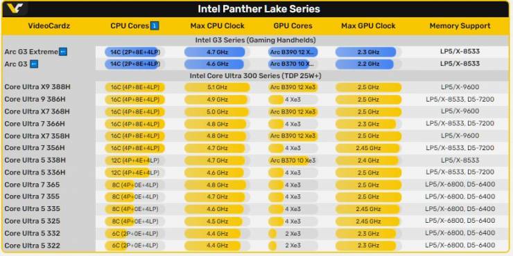 Новые процессоры Panther Lake в версиях Arc G3 и Arc G3 Extreme получат 14 ядер CPU и графику Xe3, а первые модели с ними ожидаются уже на Computex 2026.