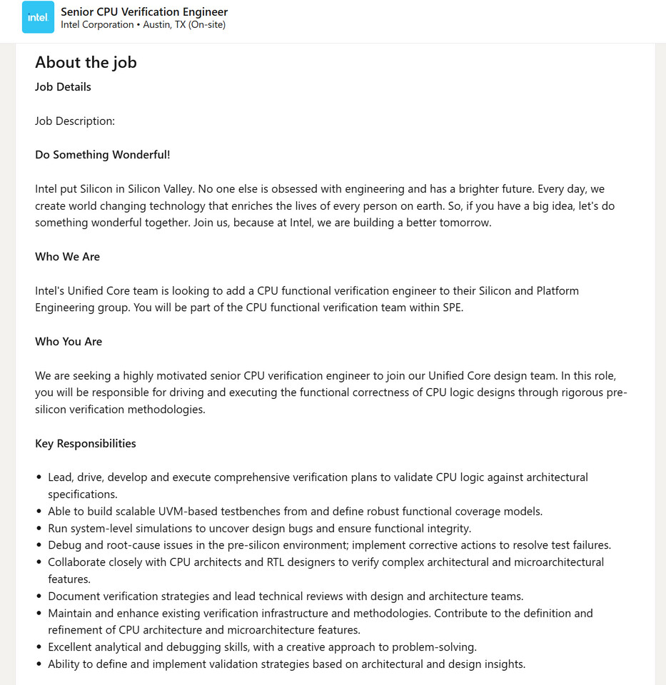Согласно новым вакансиям, Intel формирует команду инженеров для разработки микроархитектуры «Unified Core». Это означает отказ от гибридного подхода, используемого с 12‑го поколения Alder Lake, где сочетались производительные ядра (P‑cores) и энергоэффективные ядра (E‑cores).