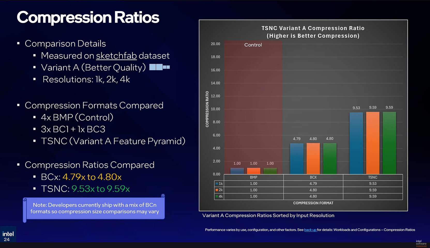 Intel представила технологию TSNC (Texture Set Neural Compression), которая позволяет сжимать игровые текстуры до 18 раз при минимальной потере качества.