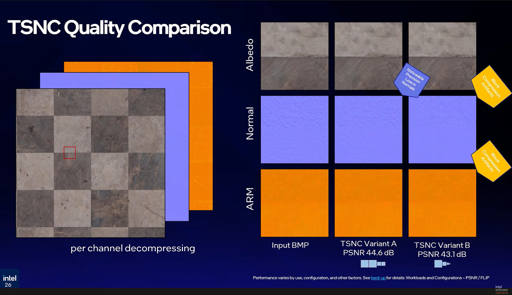 TSNC имеет два режима использования. Вариант A сжимает текстуры примерно в 9 раз с падением качества всего на 5% — практически незаметным для глаза. Вариант B обеспечивает максимальное сжатие до 18 раз, но с потерей качества до 7%, что уже немного заметнее. Для измерения разницы Intel использовала инструмент FLIP от NVIDIA.
