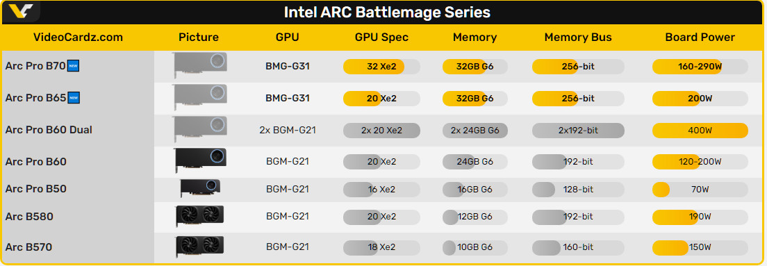 Новые модели будут доступны как в версии Intel Limited Edition, так и в вариантах от сторонних производителей. Arc Pro B70 позиционируется как более мощная видеокарта для рабочих станций, тогда как B65 фактически является модификацией B60 с увеличенным объёмом памяти. Между ними остаётся значительный разрыв в производительности, что может указывать на планы Intel выпустить дополнительные модели между B65 и B70 в будущем.
